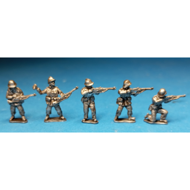 Cinco figuras de infantería republicana en combate en escala 1/72 fabricadas en metal blanco.